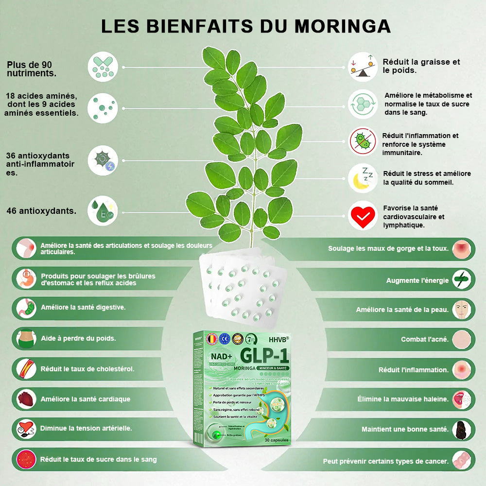 Moringa combiné aux capsules HHVB® NAD⁺ GLP-1 offre un mélange puissant de bienfaits naturels pour la santé. Riche en plus de 90 nutriments, 18 acides aminés (dont les 9 essentiels), et 46 antioxydants — dont 36 possèdent des propriétés anti-inflammatoires — Moringa soutient le métabolisme, l’immunité et le contrôle du poids.